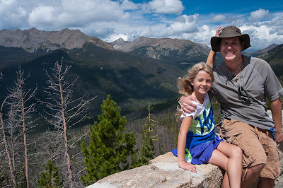 And with a turn to the right, a quick father-daughter portrait with the Never Summer Mountains as a backdrop. The rotten kid wasn't quite able to get the bunny ears behind my head before the timer went off.