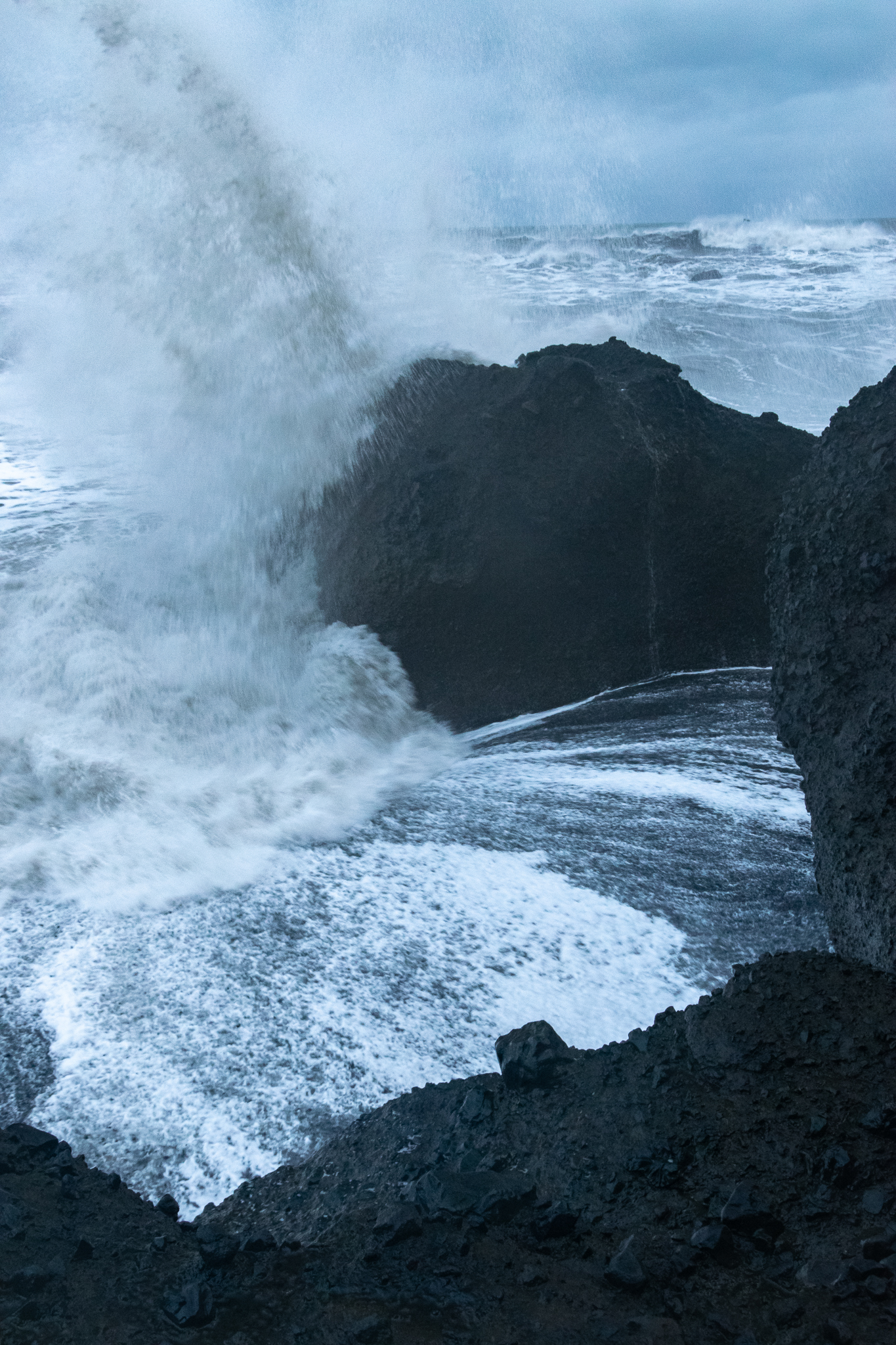 The sunset, unfortunately, was out. Thick clouds had rolled in during the afternoon. I tried to see if I could get to the Reynisdrangar sea stacks from the Víkurfjara Black Sand Beach, but the tide was too high.Time to make lemonade with these lemons, and the surf seemed strong enough for some compelling shots.